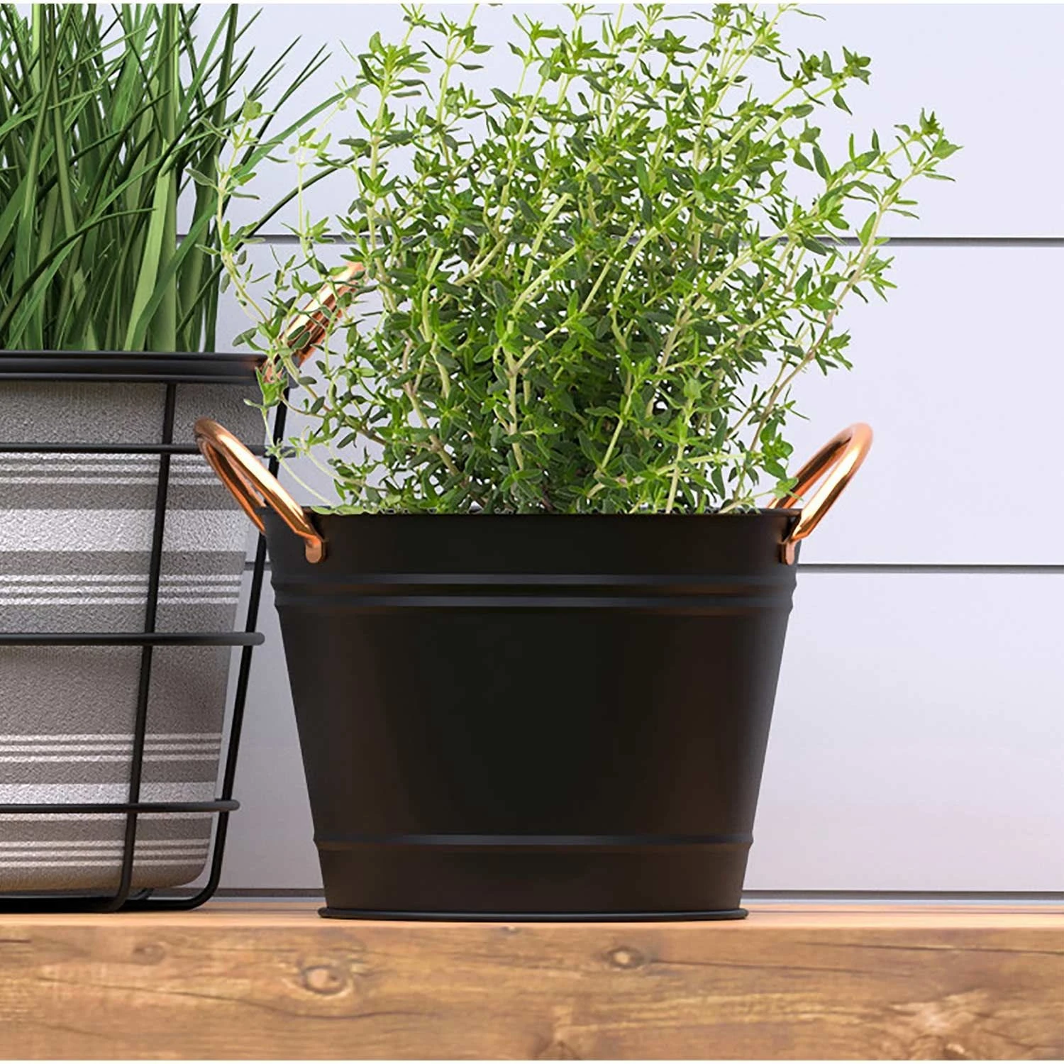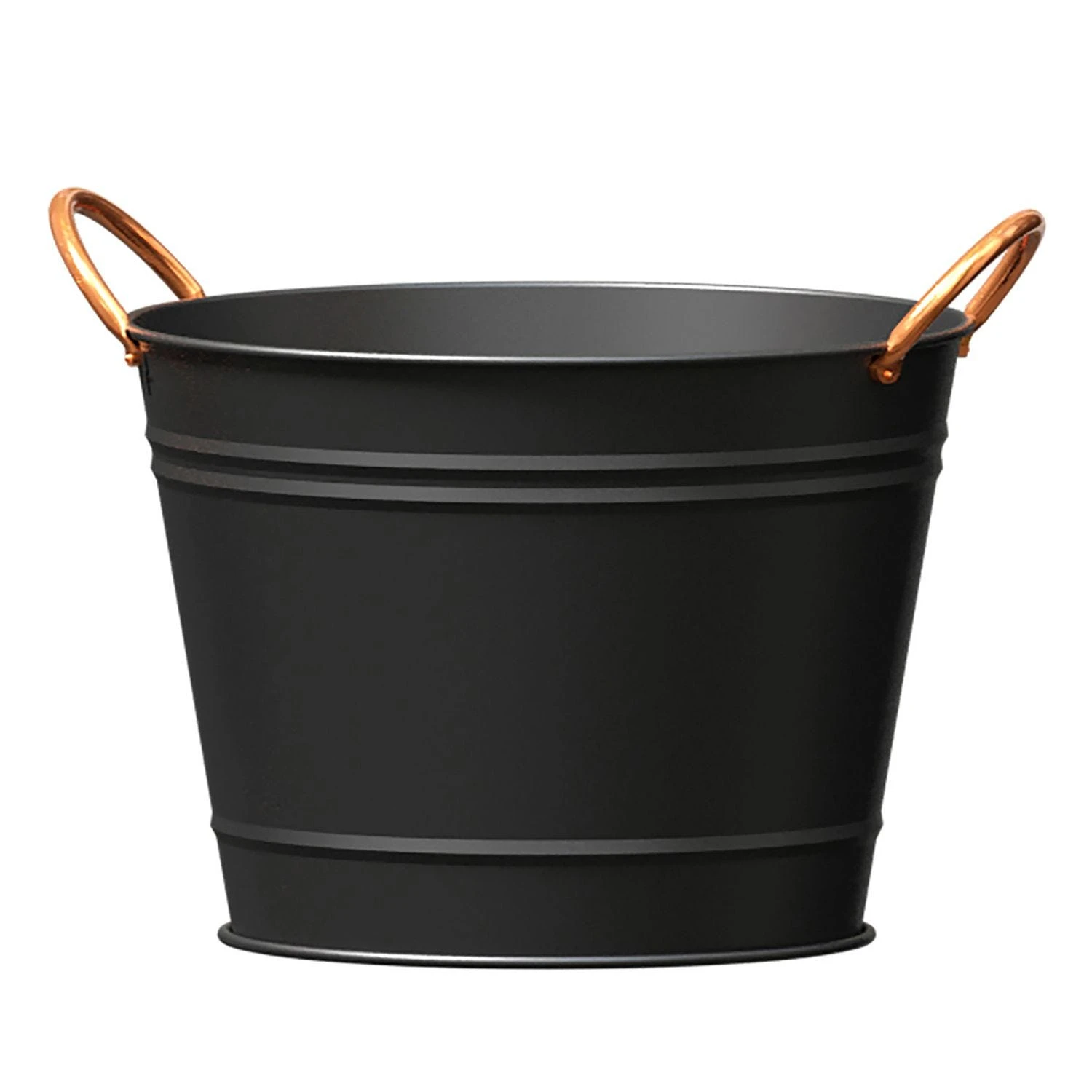 Modern farmhouse designs are on-trend, classic looking garden accessories to decorate outdoor living spaces. Decorate your table with this smart, matte black bucket planter. The sturdy riveted copper plated handles add modern appeal and make it easy to move the piece. A unique centerpiece when filled with houseplants, garden blooms or with a collection of candles. You can also add potting mixture and start your own blooms. Includes removable rubber drain plug.