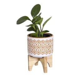 Style your space and highlight your house plants with this stylish mustard and white planter on a wood stand.