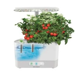 Want garden fresh tomatoes in the middle of winter? How about beautiful petunias for months on end with no florist fee? Meet the AeroGarden harvest, an indoor garden system that allows you to grow up to 6 different herb, veggie or flower varieties year-round – no sun, soil or green thumb required. The indoor garden’s grow light hood contains 20W of white, red, and blue LED lights, giving your plants the full spectrum of sunlight they need to grow, and grow quickly. The automatic timer makes sure the lights go on and off at exactly the right time, and the backlit buttons remind you when to add water and plant food. The Harvest is compact and adjusts for up to 12″ of grow height. Not to mention, it sets up in minutes. So, why wait for the perfect weather? Make everyday a great gardening day with AeroGarden Harvest indoor garden.