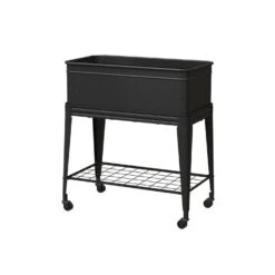 Farmhouse inspired elevated tub planter is perfect for patios, porches, balconies or backyard gardening. Easily grow herbs, vegetable or your favorite flowers anywhere you want. These unique planters are durable metal with embossed ridges and rolled edge for strength. Choose a level spot on porch, patio, deck or in yard. The locking heavy duty, castors provide flexibility to move planter to sunny locations. Cut down on maintenance, like watering and weeding with this compact garden! Store your gardening supplies on the handy bottom shelf. Use near the pool as a beverage tub, it Includes a removable drain plug. This elevated tub planter that can double as a beverage tub is functional and fun – coordinates with any indoor/outdoor decor.