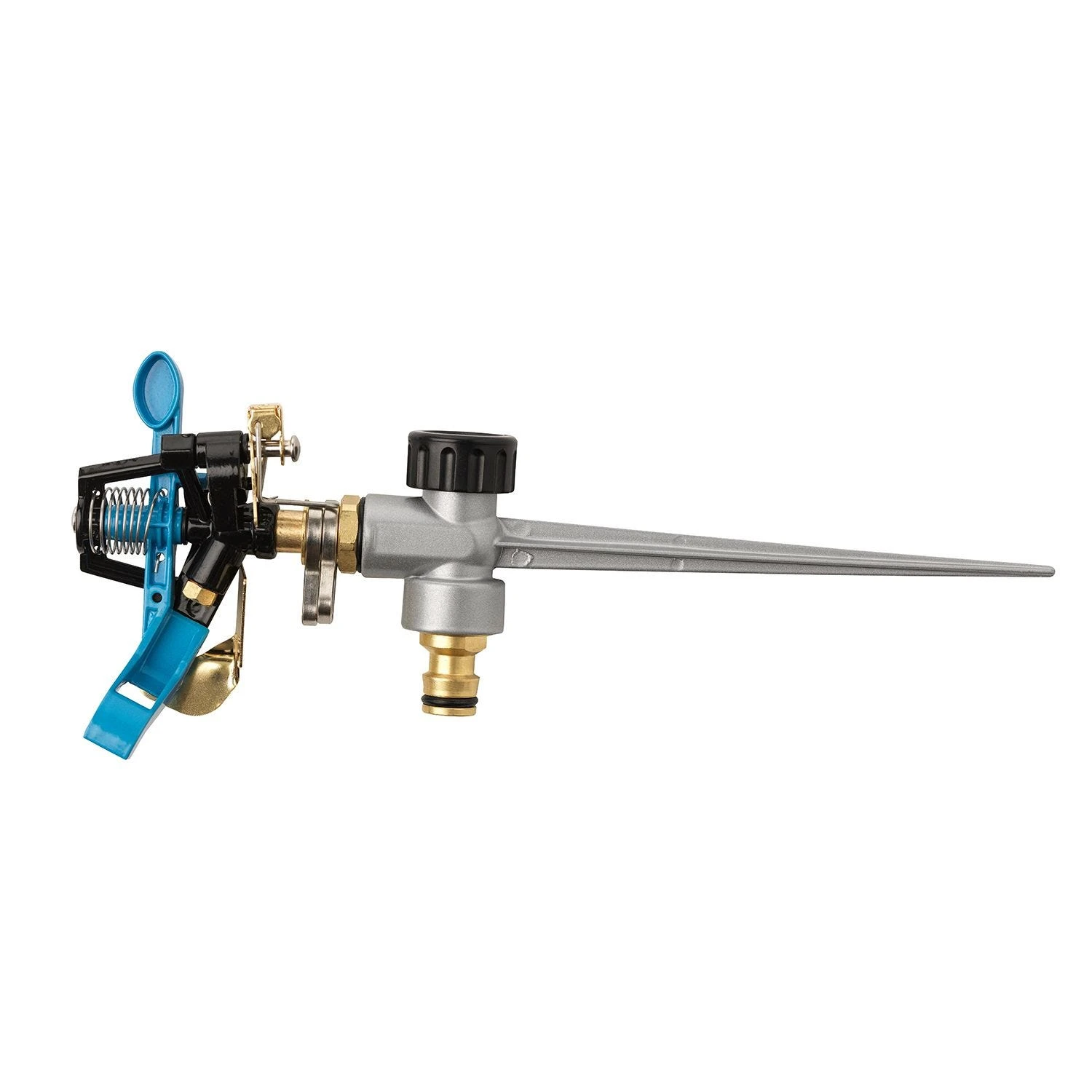 The pro flow premium impact spike sprinkler cover an area up to 3980 sqft. The distance is adjustab le from 20ft to 40ft and the watering area is adjustable over 360 degrees. It smetal construction ensures an easy and sturdy installion in the lawn. Plastic female hose connector included.